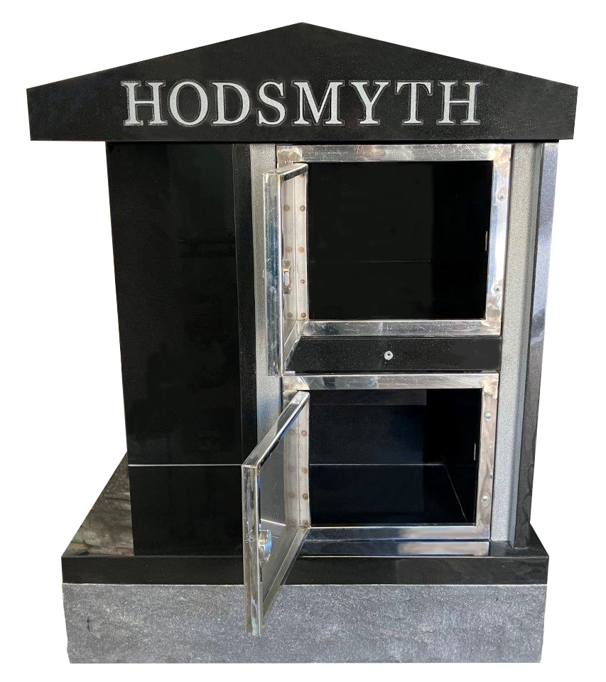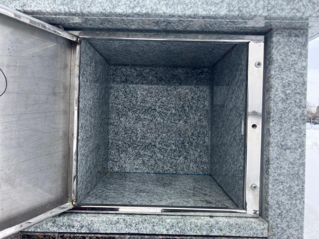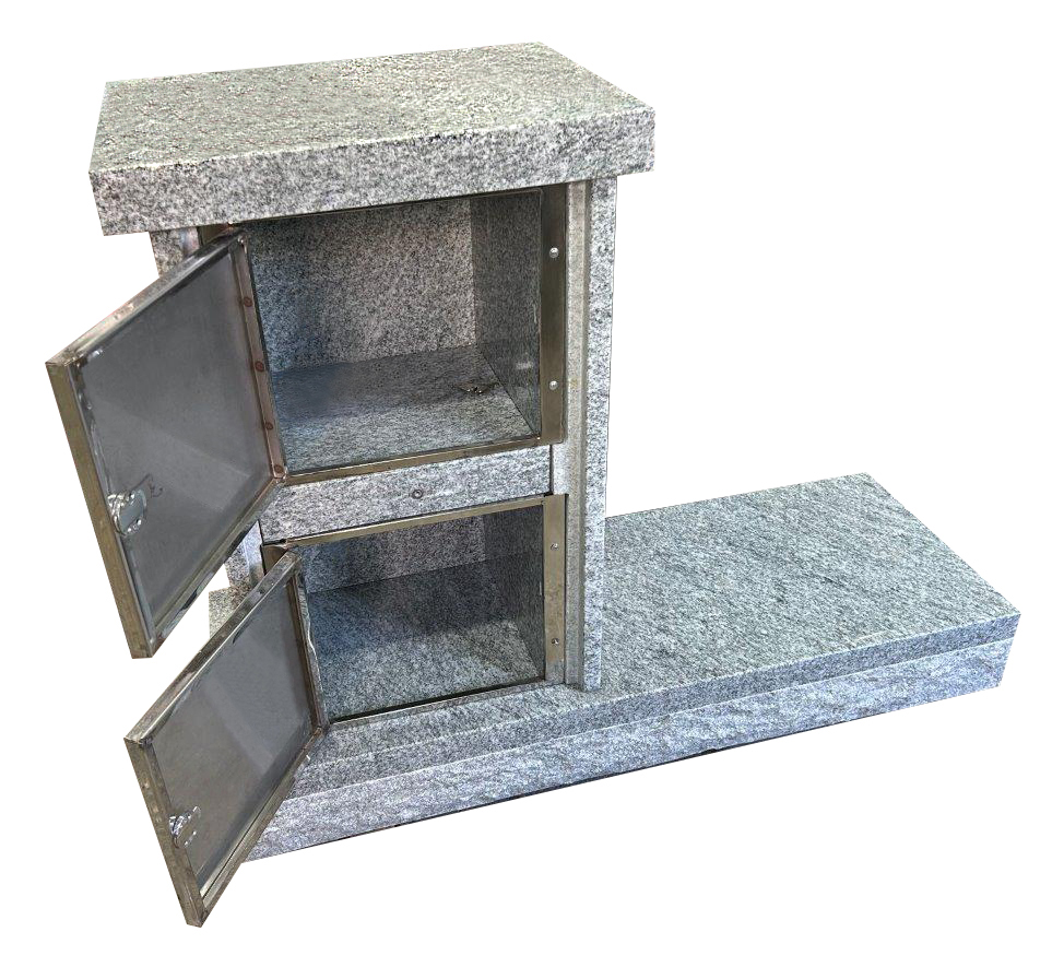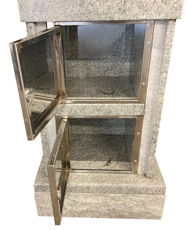 All our columbaria are constructed of 100% all granite with all the interior niches polished as well as interior stainless steel privacy locking security doors with outer security stainless steel dials and screws for the exterior shutters. All our columbarium’s are all pre-assembled and ready for immediate installation. Belts are included and all is needed is the crane to unload and put in place.